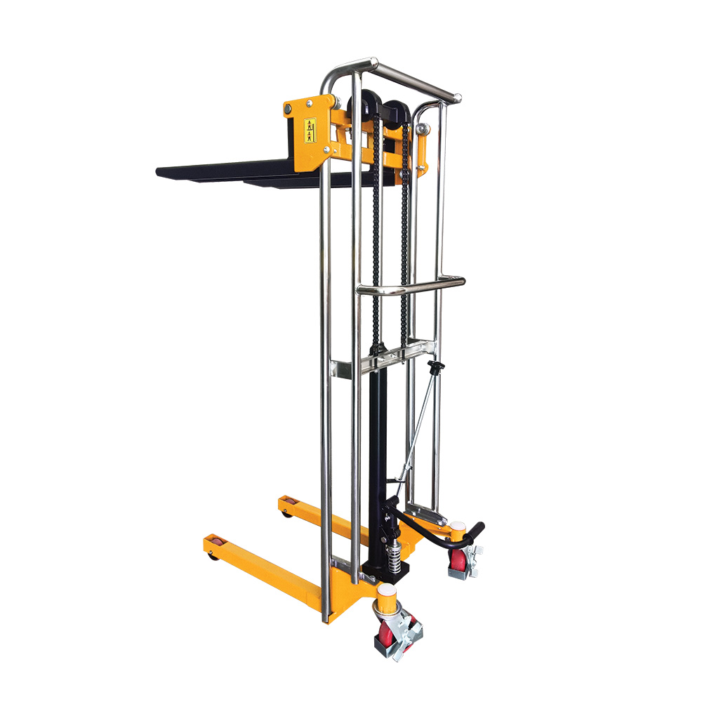 Built with a sturdy yet lightweight steel frame, this stacker ensures durability while remaining easy to maneuver in tight spaces and narrow aisles. Its manual hydraulic lifting system provides smooth lifting and lowering of goods, making it a safe and ergonomic alternative to heavy-duty forklifts for small-scale applications.